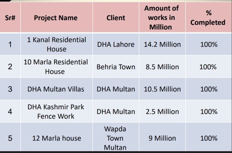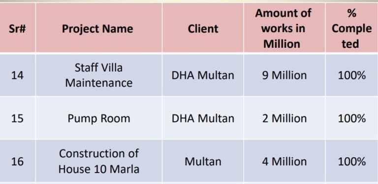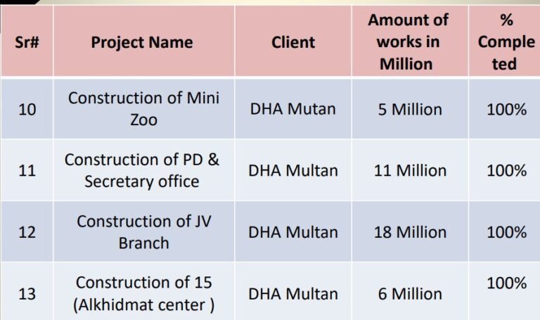 The DHA Multan Villas project located in DHA Multan has been successfully completed. The total value of the work was 10.5 million, and the project has achieved 100% completion.