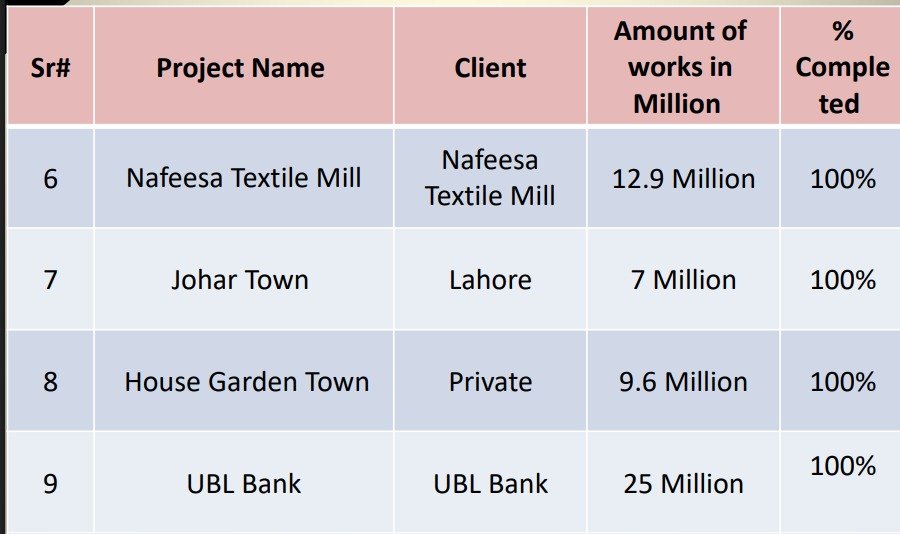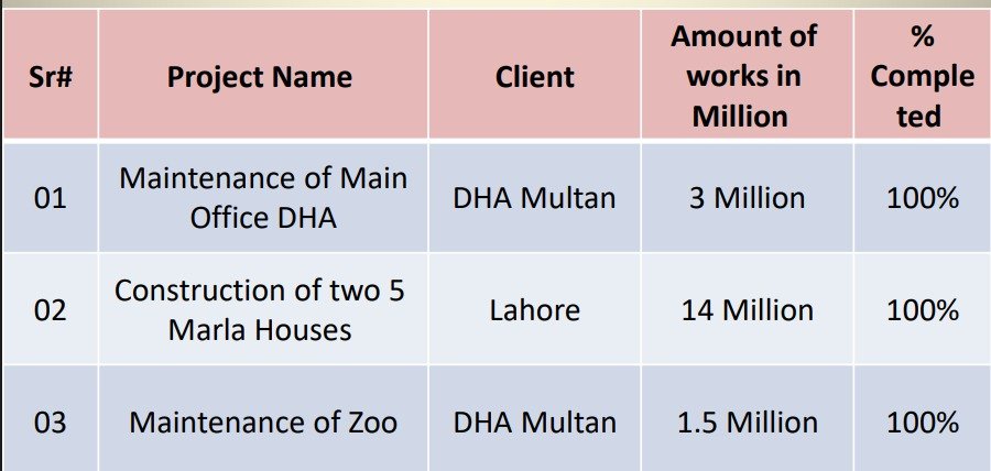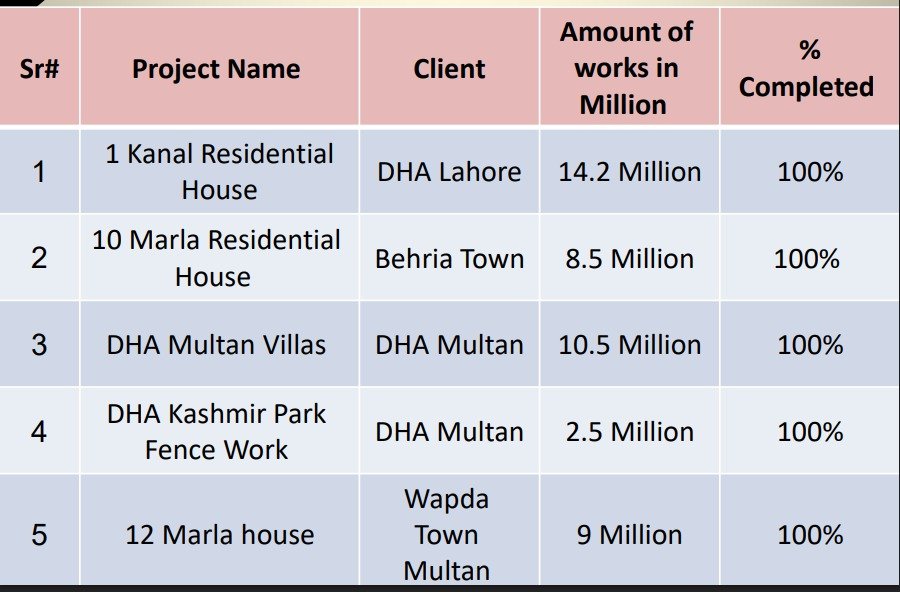 The DHA Multan Villas project located in DHA Multan has been successfully completed. The total value of the work was 10.5 million, and the project has achieved 100% completion.